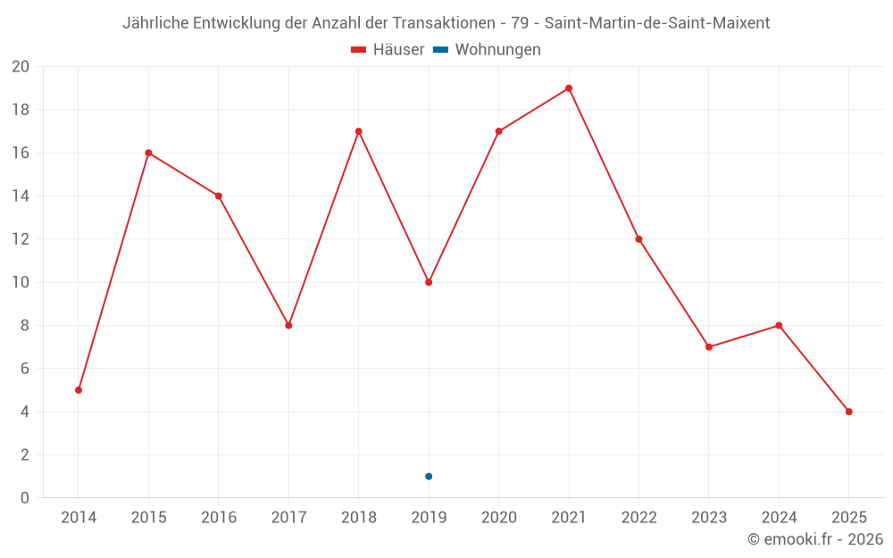 Der Durchschnittspreis auf den 16 Hausgeschäften der letzten 24 Monate in der Gemeinde Saint-Martin-de-Saint-Maixent betrug 1 283 € pro Quadratmeter für einen mittleren Immobilienwert von 144 000 €. Über diesen Zeitraum hinweg lagen 60% der Transaktionen zwischen 807 und 1 951 € pro Quadratmeter (vom 2. bis zum 8. Dezil).