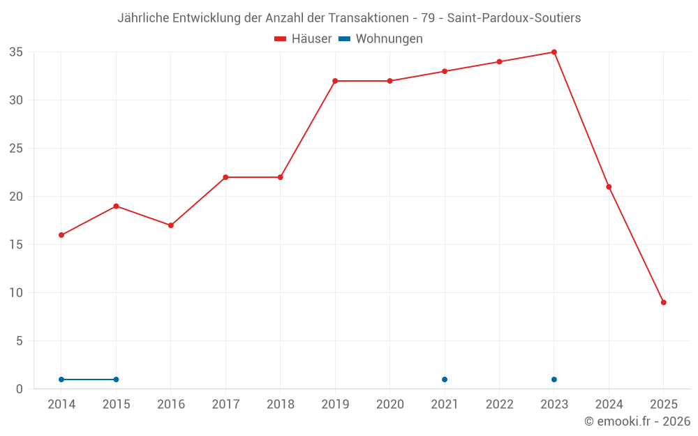 Der Durchschnittspreis auf den 22 Hausgeschäften der letzten 12 Monate in der Gemeinde Saint-Pardoux-Soutiers betrug 989 € pro Quadratmeter für einen mittleren Immobilienwert von 103 000 €. Über diesen Zeitraum hinweg lagen 60% der Transaktionen zwischen 765 und 1 474 € pro Quadratmeter (vom 2. bis zum 8. Dezil).