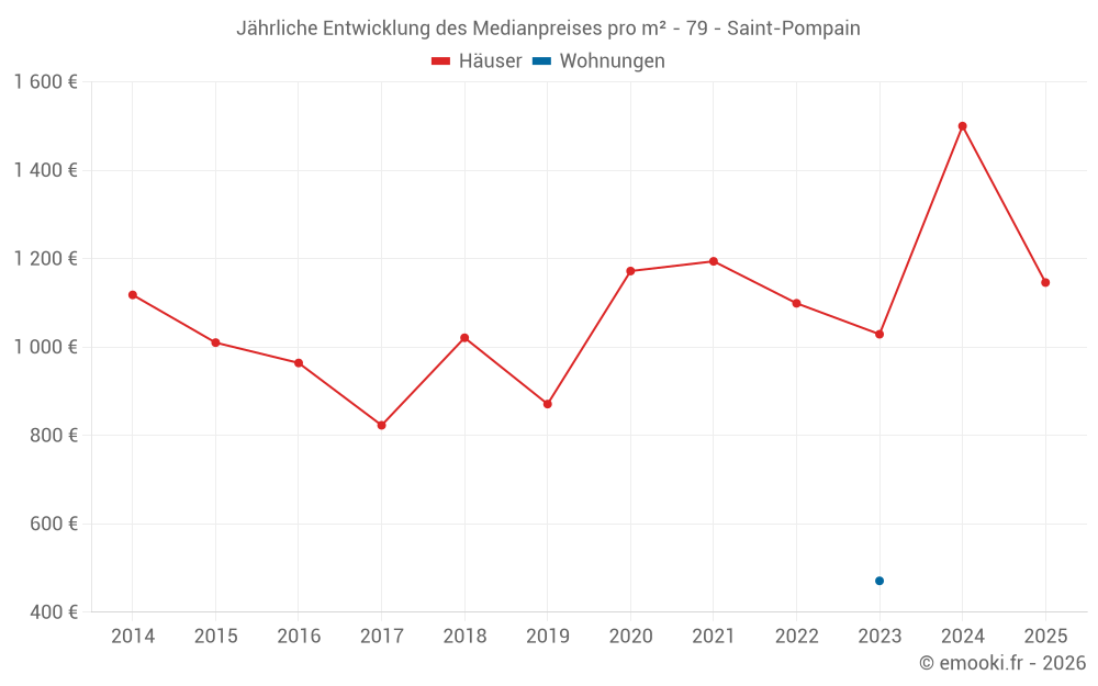 Der Durchschnittspreis auf den 26 Hausgeschäften der letzten 24 Monate in der Gemeinde Saint-Pompain betrug 1 201 € pro Quadratmeter für einen mittleren Immobilienwert von 128 500 €. Über diesen Zeitraum hinweg lagen 60% der Transaktionen zwischen 639 und 1 862 € pro Quadratmeter (vom 2. bis zum 8. Dezil).