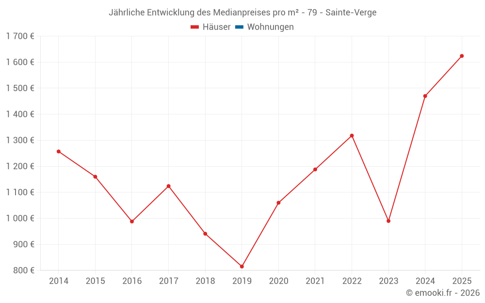 Der Durchschnittspreis auf den 24 Hausgeschäften der letzten 24 Monate in der Gemeinde Sainte-Verge betrug 1 434 € pro Quadratmeter für einen mittleren Immobilienwert von 106 400 €. Über diesen Zeitraum hinweg lagen 60% der Transaktionen zwischen 925 und 1 621 € pro Quadratmeter (vom 2. bis zum 8. Dezil).