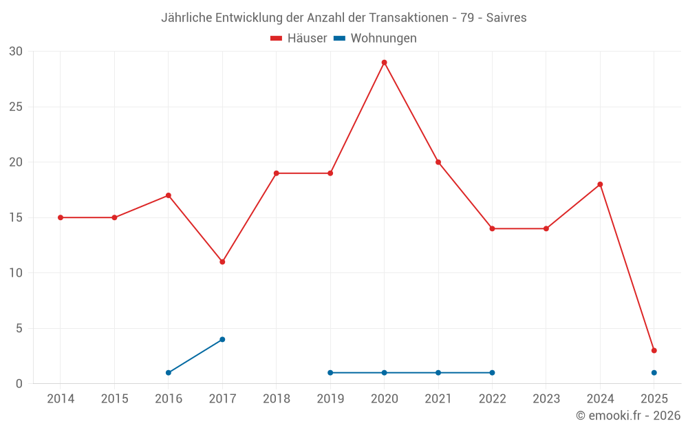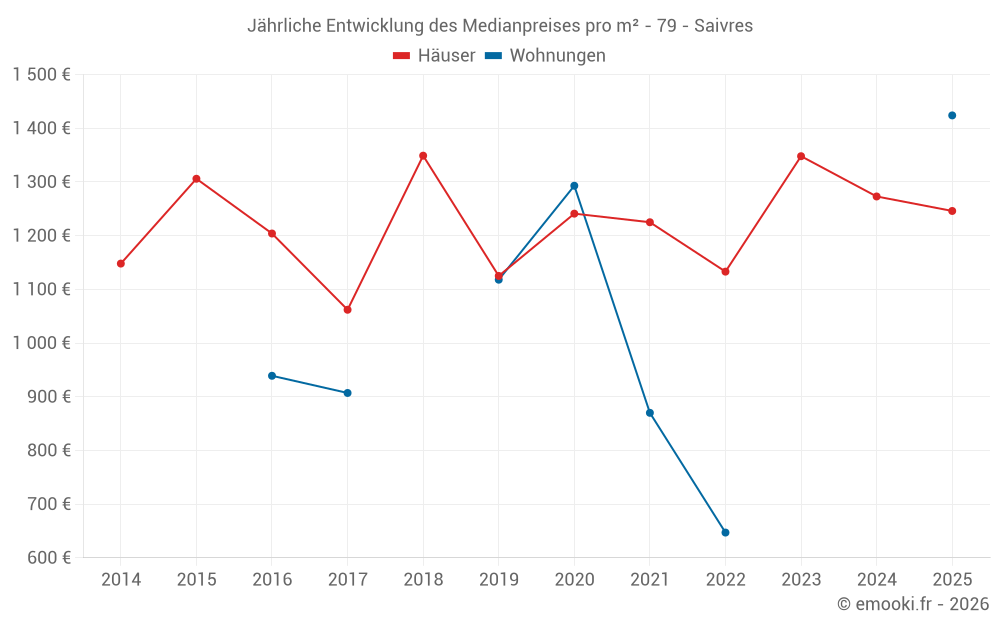 Der Durchschnittspreis auf den 26 Hausgeschäften der letzten 24 Monate in der Gemeinde Saivres betrug 1 280 € pro Quadratmeter für einen mittleren Immobilienwert von 150 000 €. Über diesen Zeitraum hinweg lagen 60% der Transaktionen zwischen 638 und 1 667 € pro Quadratmeter (vom 2. bis zum 8. Dezil).