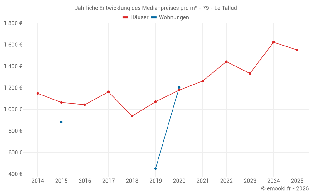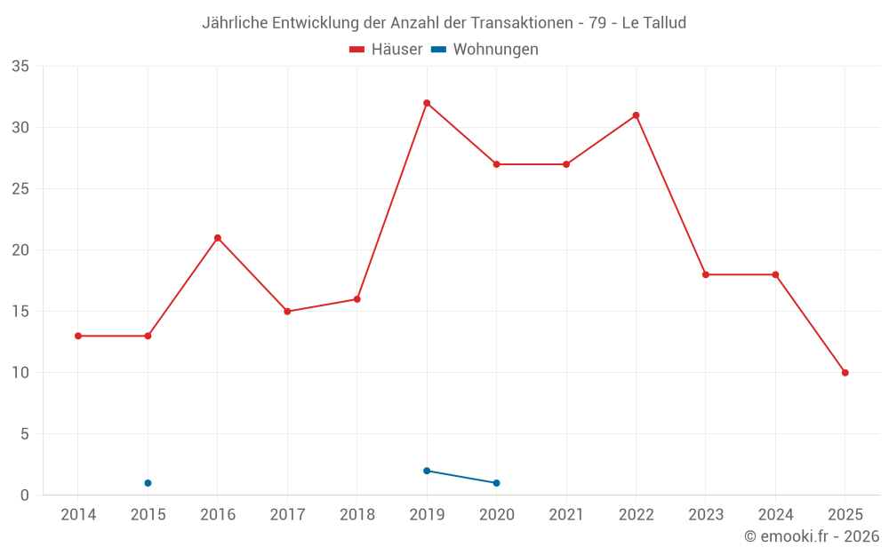 Der Durchschnittspreis auf den 20 Hausgeschäften der letzten 12 Monate in der Gemeinde Le Tallud betrug 1 624 € pro Quadratmeter für einen mittleren Immobilienwert von 156 000 €. Über diesen Zeitraum hinweg lagen 60% der Transaktionen zwischen 906 und 1 754 € pro Quadratmeter (vom 2. bis zum 8. Dezil).