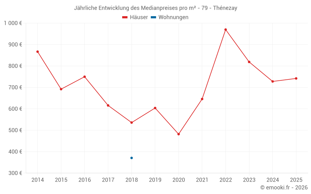 Der Durchschnittspreis auf den 18 Hausgeschäften der letzten 12 Monate in der Gemeinde Thénezay betrug 844 € pro Quadratmeter für einen mittleren Immobilienwert von 93 280 €. Über diesen Zeitraum hinweg lagen 60% der Transaktionen zwischen 465 und 1 184 € pro Quadratmeter (vom 2. bis zum 8. Dezil).