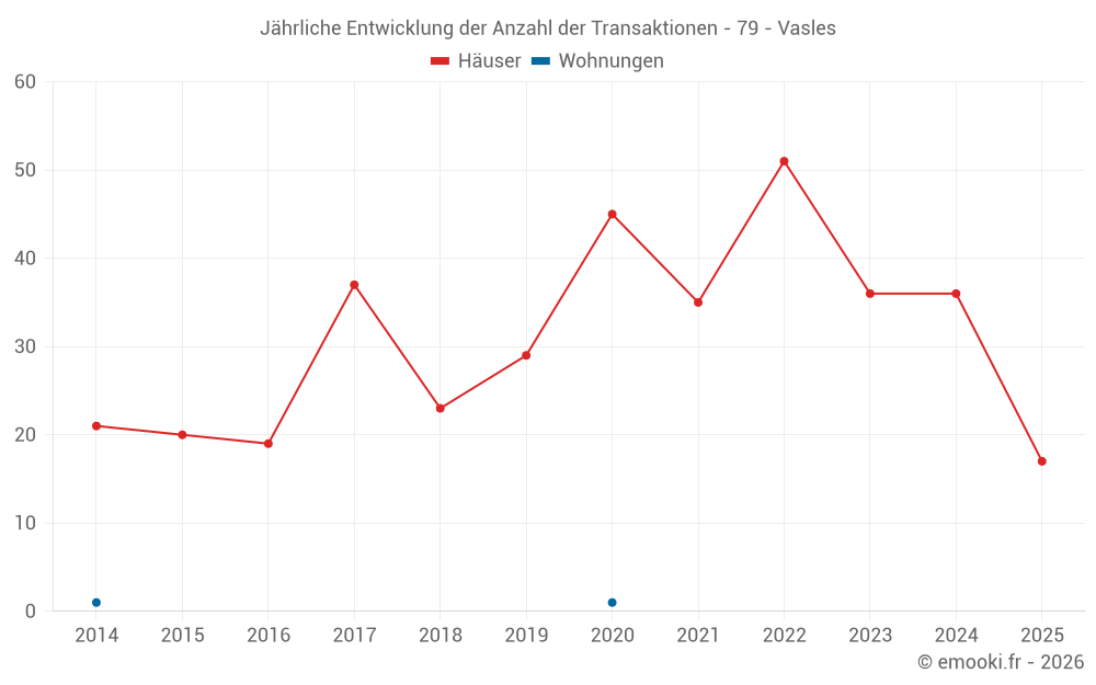 Der Durchschnittspreis auf den 38 Hausgeschäften der letzten 12 Monate in der Gemeinde Vasles betrug 1 130 € pro Quadratmeter für einen mittleren Immobilienwert von 126 500 €. Über diesen Zeitraum hinweg lagen 60% der Transaktionen zwischen 713 und 1 678 € pro Quadratmeter (vom 2. bis zum 8. Dezil).