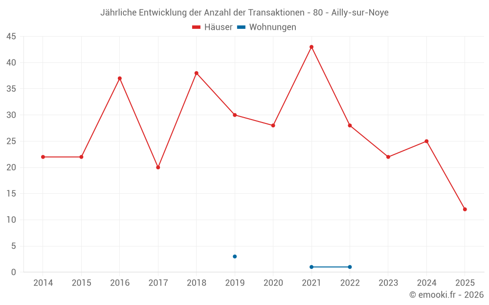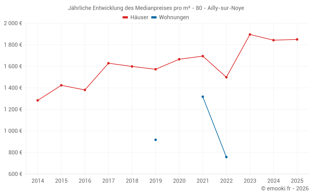 Der Durchschnittspreis auf den 30 Hausgeschäften der letzten 12 Monate in der Gemeinde Ailly-sur-Noye betrug 1 826 € pro Quadratmeter für einen mittleren Immobilienwert von 137 000 €. Über diesen Zeitraum hinweg lagen 60% der Transaktionen zwischen 1 266 und 2 045 € pro Quadratmeter (vom 2. bis zum 8. Dezil).
