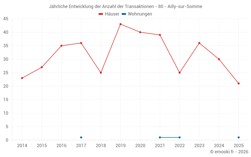 Der Durchschnittspreis auf den 21 Hausgeschäften der letzten 6 Monate in der Gemeinde Ailly-sur-Somme betrug 1 852 € pro Quadratmeter für einen mittleren Immobilienwert von 150 000 €. Über diesen Zeitraum hinweg lagen 60% der Transaktionen zwischen 1 613 und 2 232 € pro Quadratmeter (vom 2. bis zum 8. Dezil).