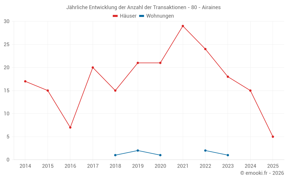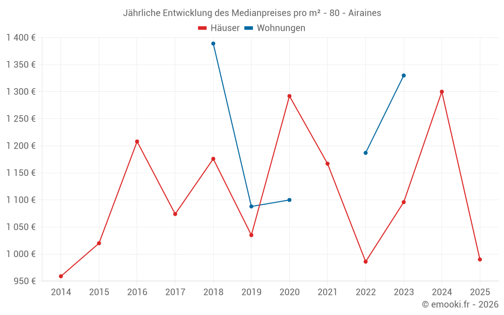 Der Durchschnittspreis auf den 27 Hausgeschäften der letzten 24 Monate in der Gemeinde Airaines betrug 1 316 € pro Quadratmeter für einen mittleren Immobilienwert von 110 000 €. Über diesen Zeitraum hinweg lagen 60% der Transaktionen zwischen 885 und 1 735 € pro Quadratmeter (vom 2. bis zum 8. Dezil).