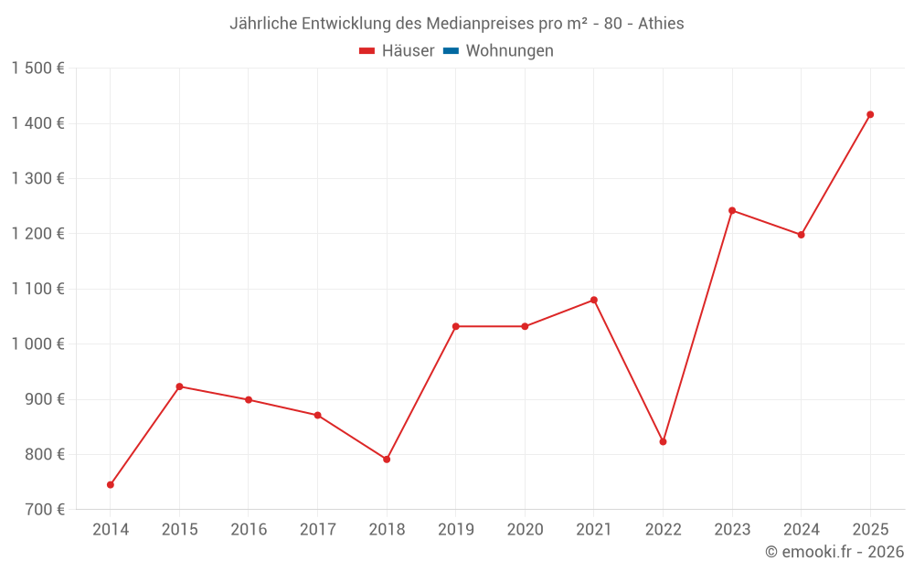 Der Durchschnittspreis auf den 15 Hausgeschäften der letzten 24 Monate in der Gemeinde Athies betrug 1 331 € pro Quadratmeter für einen mittleren Immobilienwert von 104 000 €. Über diesen Zeitraum hinweg lagen 60% der Transaktionen zwischen 603 und 1 518 € pro Quadratmeter (vom 2. bis zum 8. Dezil).