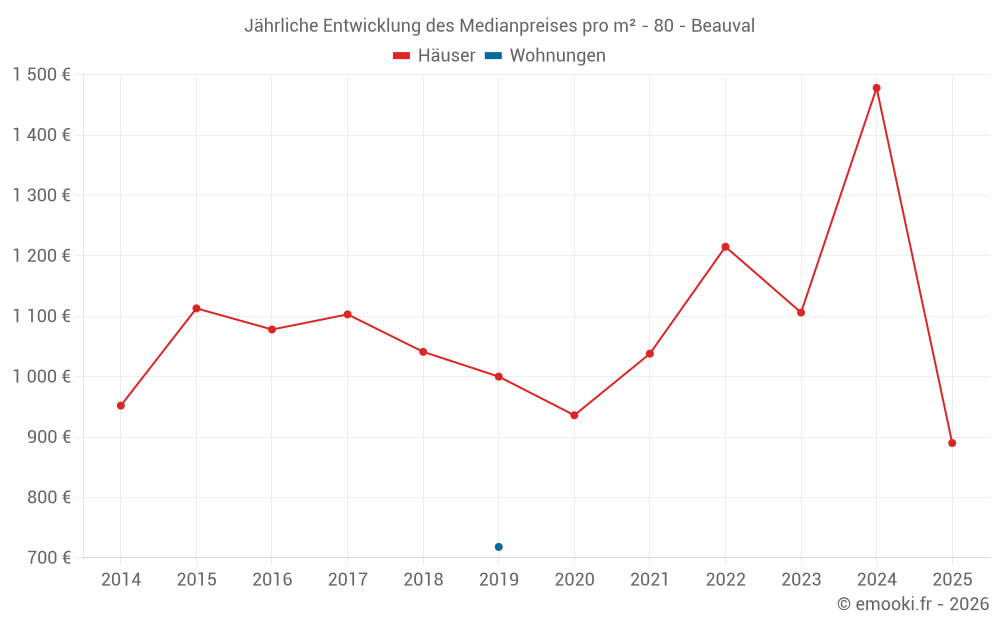 Der Durchschnittspreis auf den 34 Hausgeschäften der letzten 12 Monate in der Gemeinde Beauval betrug 1 196 € pro Quadratmeter für einen mittleren Immobilienwert von 119 225 €. Über diesen Zeitraum hinweg lagen 60% der Transaktionen zwischen 712 und 1 576 € pro Quadratmeter (vom 2. bis zum 8. Dezil).