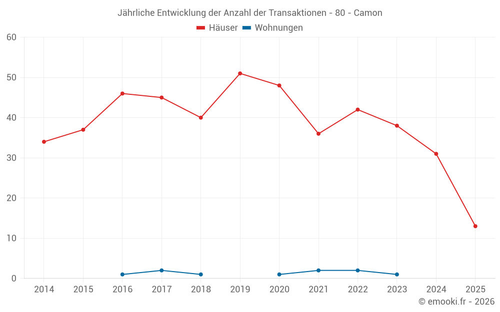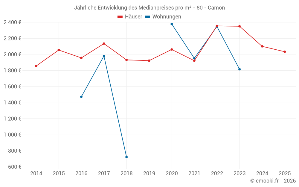 Der Durchschnittspreis auf den 30 Hausgeschäften der letzten 12 Monate in der Gemeinde Camon betrug 2 177 € pro Quadratmeter für einen mittleren Immobilienwert von 179 250 €. Über diesen Zeitraum hinweg lagen 60% der Transaktionen zwischen 1 913 und 2 712 € pro Quadratmeter (vom 2. bis zum 8. Dezil).