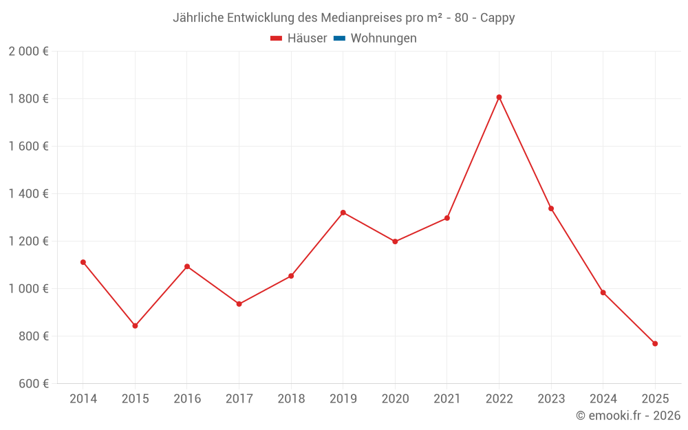 Der Durchschnittspreis auf den 14 Hausgeschäften der letzten 24 Monate in der Gemeinde Cappy betrug 1 117 € pro Quadratmeter für einen mittleren Immobilienwert von 77 500 €. Über diesen Zeitraum hinweg lagen 60% der Transaktionen zwischen 717 und 1 504 € pro Quadratmeter (vom 2. bis zum 8. Dezil).