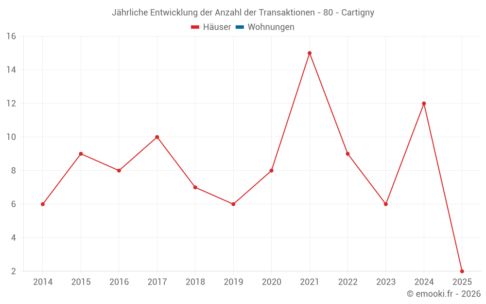 Der Durchschnittspreis auf den 17 Hausgeschäften der letzten 24 Monate in der Gemeinde Cartigny betrug 1 200 € pro Quadratmeter für einen mittleren Immobilienwert von 83 000 €. Über diesen Zeitraum hinweg lagen 60% der Transaktionen zwischen 783 und 1 295 € pro Quadratmeter (vom 2. bis zum 8. Dezil).