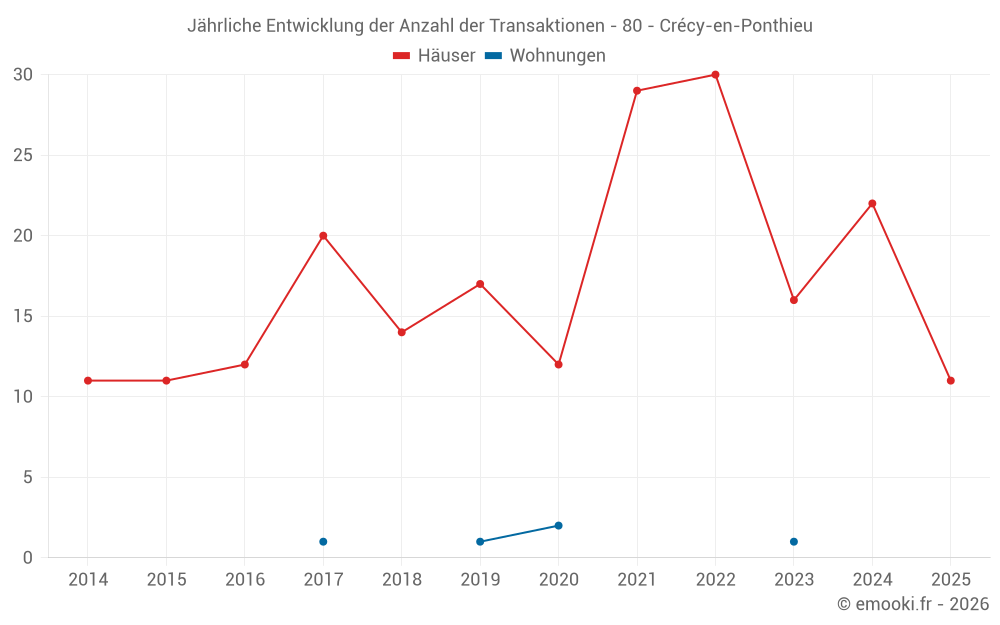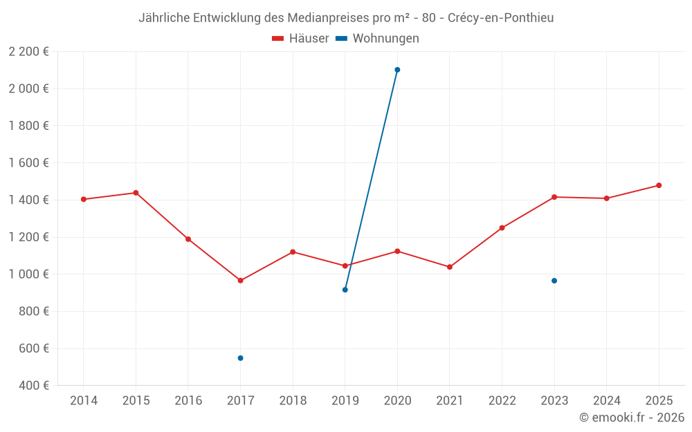 Der Durchschnittspreis auf den 29 Hausgeschäften der letzten 12 Monate in der Gemeinde Crécy-en-Ponthieu betrug 1 423 € pro Quadratmeter für einen mittleren Immobilienwert von 130 000 €. Über diesen Zeitraum hinweg lagen 60% der Transaktionen zwischen 765 und 1 621 € pro Quadratmeter (vom 2. bis zum 8. Dezil).