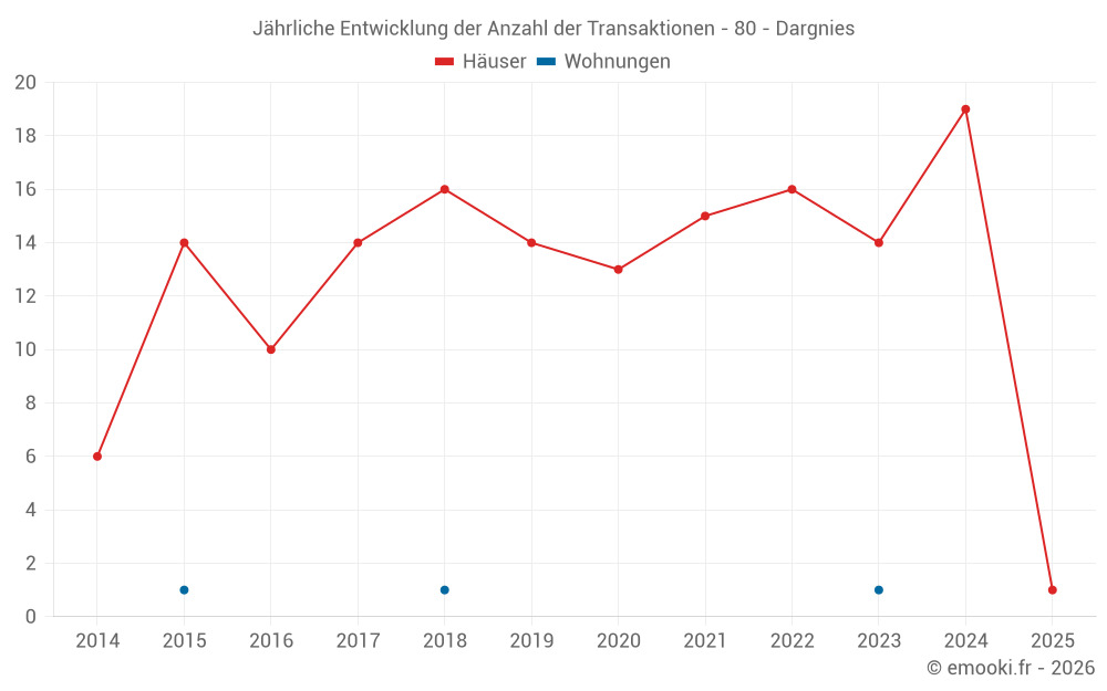 Der Durchschnittspreis auf den 27 Hausgeschäften der letzten 24 Monate in der Gemeinde Dargnies betrug 1 743 € pro Quadratmeter für einen mittleren Immobilienwert von 108 000 €. Über diesen Zeitraum hinweg lagen 60% der Transaktionen zwischen 1 023 und 2 054 € pro Quadratmeter (vom 2. bis zum 8. Dezil).