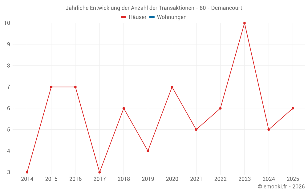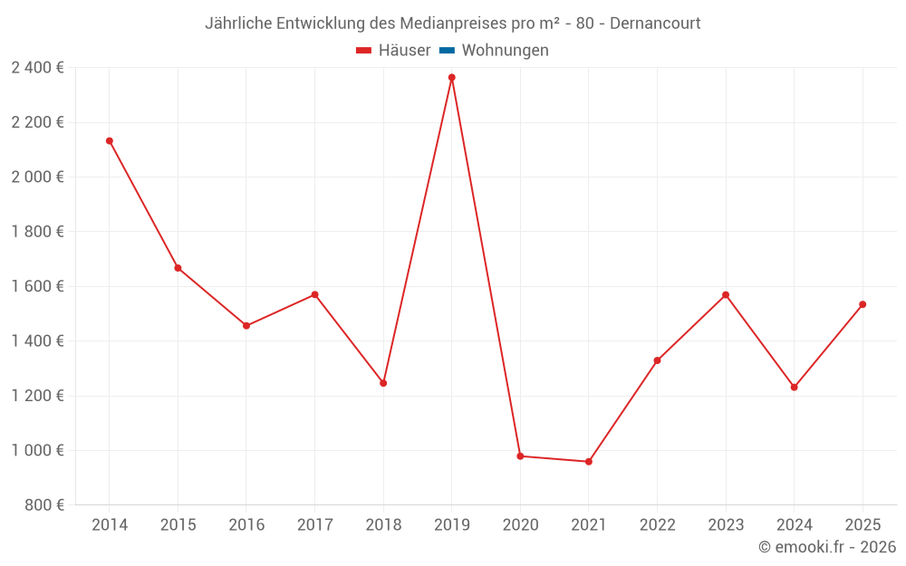 Der Durchschnittspreis auf den 17 Hausgeschäften der letzten 24 Monate in der Gemeinde Dernancourt betrug 1 519 € pro Quadratmeter für einen mittleren Immobilienwert von 131 000 €. Über diesen Zeitraum hinweg lagen 60% der Transaktionen zwischen 1 025 und 2 161 € pro Quadratmeter (vom 2. bis zum 8. Dezil).