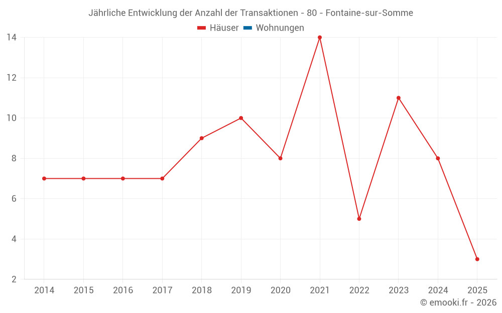 Der Durchschnittspreis auf den 19 Hausgeschäften der letzten 24 Monate in der Gemeinde Fontaine-sur-Somme betrug 1 484 € pro Quadratmeter für einen mittleren Immobilienwert von 139 000 €. Über diesen Zeitraum hinweg lagen 60% der Transaktionen zwischen 1 180 und 1 877 € pro Quadratmeter (vom 2. bis zum 8. Dezil).