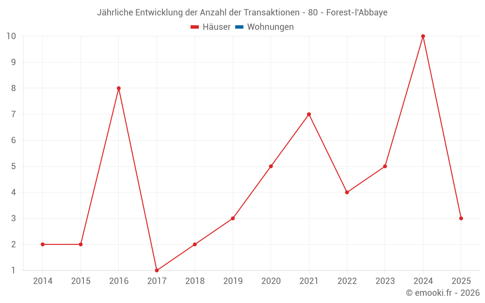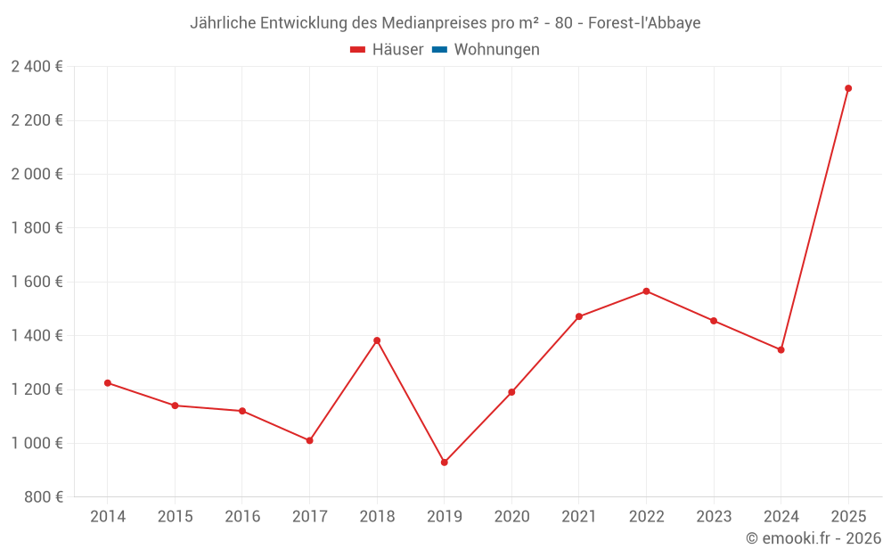 Der Durchschnittspreis auf den 14 Hausgeschäften der letzten 24 Monate in der Gemeinde Forest-l'Abbaye betrug 1 621 € pro Quadratmeter für einen mittleren Immobilienwert von 170 000 €. Über diesen Zeitraum hinweg lagen 60% der Transaktionen zwischen 1 269 und 1 897 € pro Quadratmeter (vom 2. bis zum 8. Dezil).