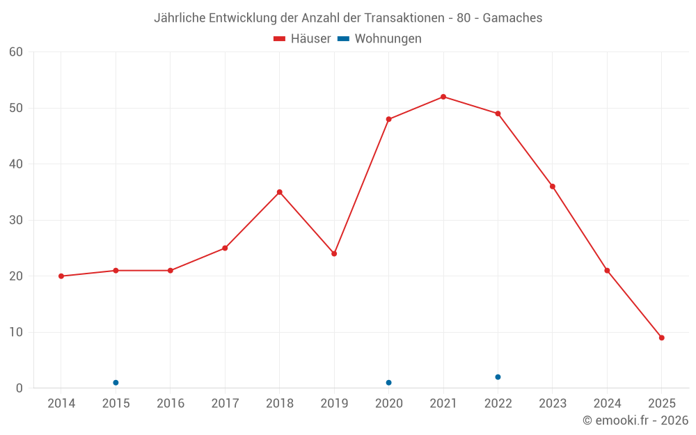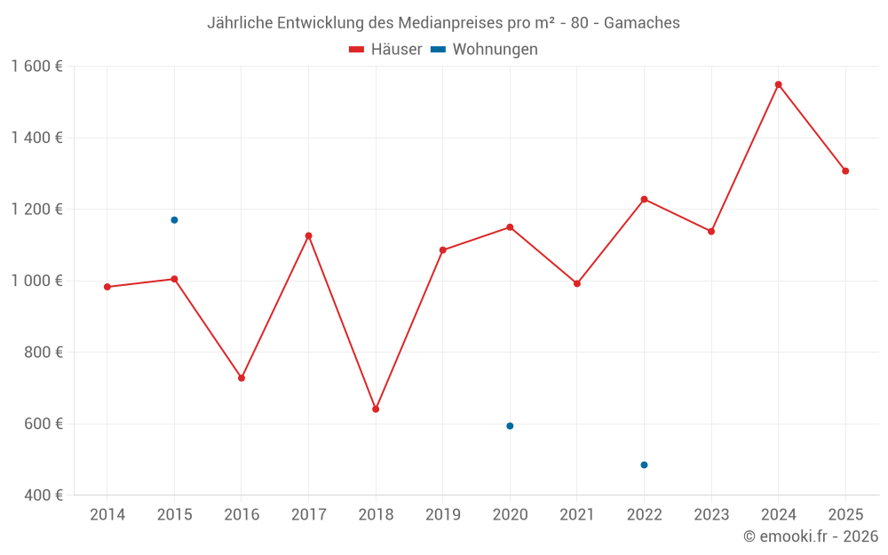 Der Durchschnittspreis auf den 23 Hausgeschäften der letzten 12 Monate in der Gemeinde Gamaches betrug 1 549 € pro Quadratmeter für einen mittleren Immobilienwert von 117 250 €. Über diesen Zeitraum hinweg lagen 60% der Transaktionen zwischen 1 014 und 1 847 € pro Quadratmeter (vom 2. bis zum 8. Dezil).