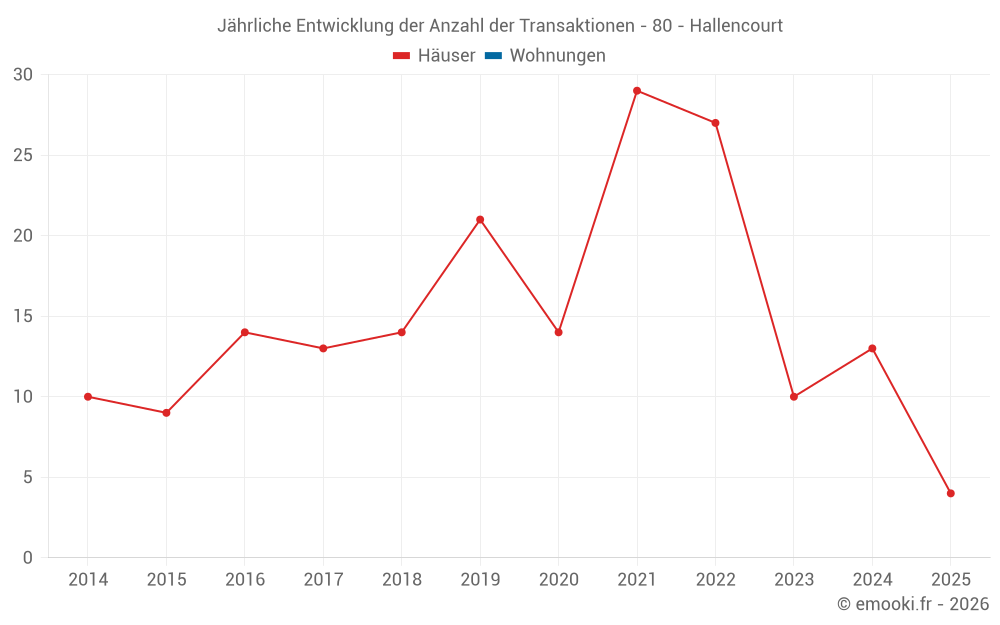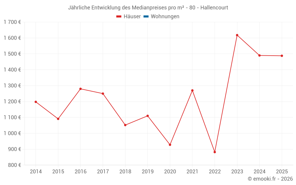 Der Durchschnittspreis auf den 22 Hausgeschäften der letzten 24 Monate in der Gemeinde Hallencourt betrug 1 506 € pro Quadratmeter für einen mittleren Immobilienwert von 125 000 €. Über diesen Zeitraum hinweg lagen 60% der Transaktionen zwischen 643 und 1 700 € pro Quadratmeter (vom 2. bis zum 8. Dezil).