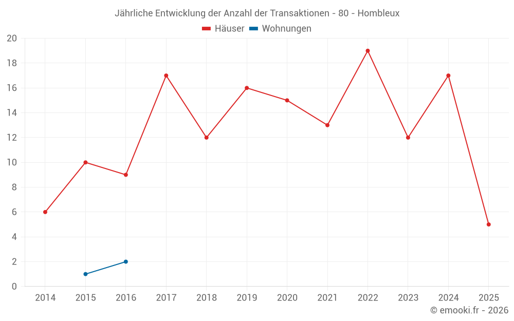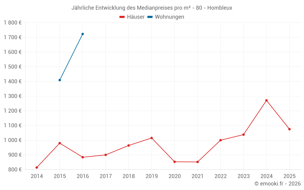 Der Durchschnittspreis auf den 28 Hausgeschäften der letzten 24 Monate in der Gemeinde Hombleux betrug 1 126 € pro Quadratmeter für einen mittleren Immobilienwert von 107 000 €. Über diesen Zeitraum hinweg lagen 60% der Transaktionen zwischen 907 und 1 527 € pro Quadratmeter (vom 2. bis zum 8. Dezil).