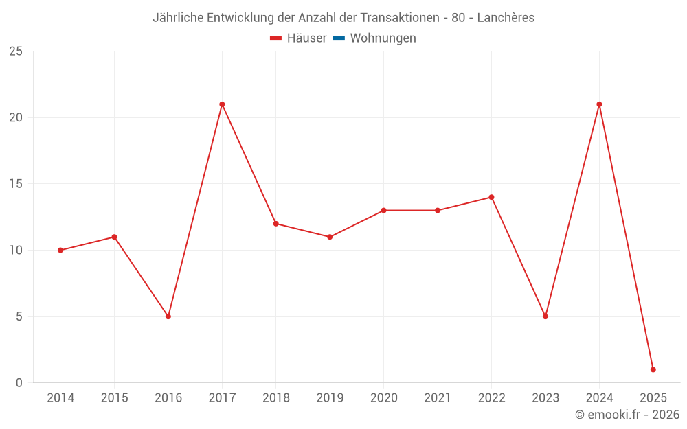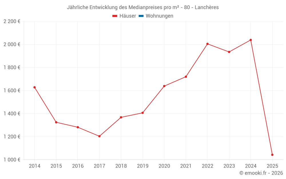 Der Durchschnittspreis auf den 26 Hausgeschäften der letzten 24 Monate in der Gemeinde Lanchères betrug 1 905 € pro Quadratmeter für einen mittleren Immobilienwert von 135 000 €. Über diesen Zeitraum hinweg lagen 60% der Transaktionen zwischen 1 049 und 2 604 € pro Quadratmeter (vom 2. bis zum 8. Dezil).