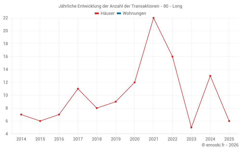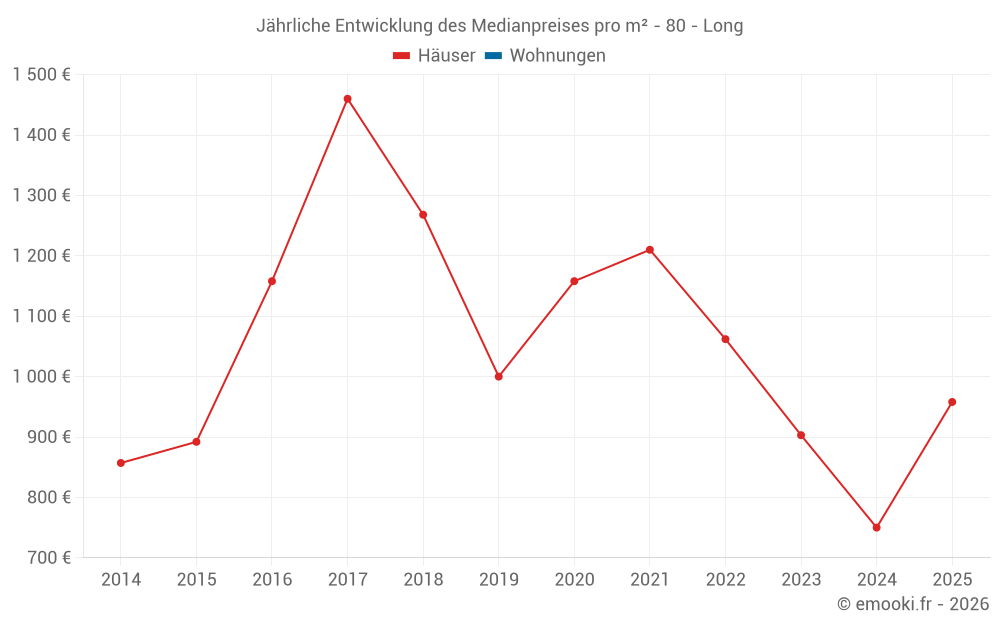 Der Durchschnittspreis auf den 23 Hausgeschäften der letzten 24 Monate in der Gemeinde Long betrug 877 € pro Quadratmeter für einen mittleren Immobilienwert von 68 000 €. Über diesen Zeitraum hinweg lagen 60% der Transaktionen zwischen 435 und 1 416 € pro Quadratmeter (vom 2. bis zum 8. Dezil).