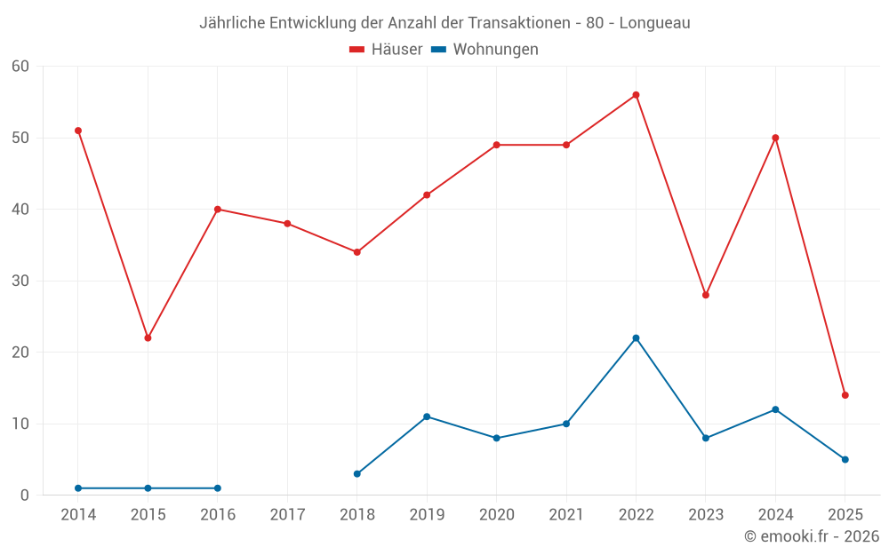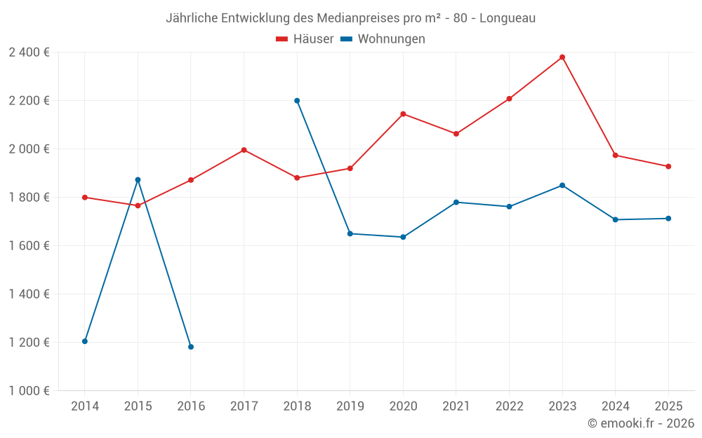 Der Durchschnittspreis auf den 42 Hausgeschäften der letzten 12 Monate in der Gemeinde Longueau betrug 1 966 € pro Quadratmeter für einen mittleren Immobilienwert von 163 000 €. Über diesen Zeitraum hinweg lagen 60% der Transaktionen zwischen 1 793 und 2 379 € pro Quadratmeter (vom 2. bis zum 8. Dezil).