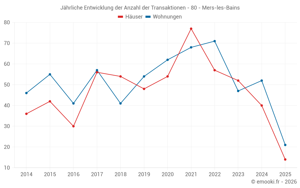 Der Durchschnittspreis auf den 32 Hausgeschäften der letzten 12 Monate in der Gemeinde Mers-les-Bains betrug 2 051 € pro Quadratmeter für einen mittleren Immobilienwert von 154 063 €. Über diesen Zeitraum hinweg lagen 60% der Transaktionen zwischen 1 432 und 2 493 € pro Quadratmeter (vom 2. bis zum 8. Dezil).