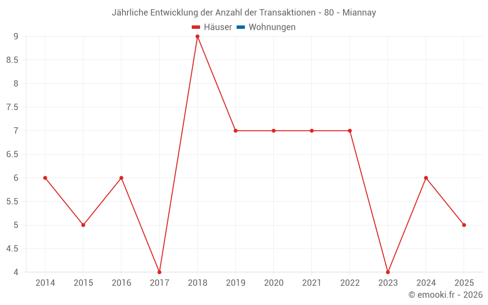 Der Durchschnittspreis auf den 15 Hausgeschäften der letzten 24 Monate in der Gemeinde Miannay betrug 1 101 € pro Quadratmeter für einen mittleren Immobilienwert von 134 738 €. Über diesen Zeitraum hinweg lagen 60% der Transaktionen zwischen 637 und 1 970 € pro Quadratmeter (vom 2. bis zum 8. Dezil).