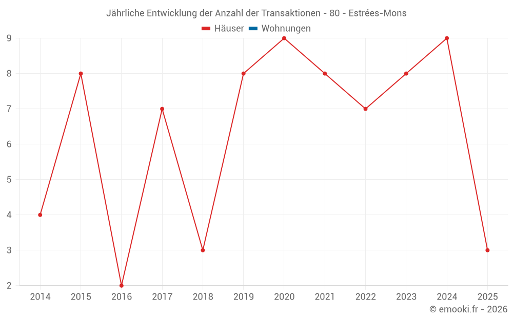 Der Durchschnittspreis auf den 17 Hausgeschäften der letzten 24 Monate in der Gemeinde Estrées-Mons betrug 1 119 € pro Quadratmeter für einen mittleren Immobilienwert von 87 500 €. Über diesen Zeitraum hinweg lagen 60% der Transaktionen zwischen 713 und 1 573 € pro Quadratmeter (vom 2. bis zum 8. Dezil).