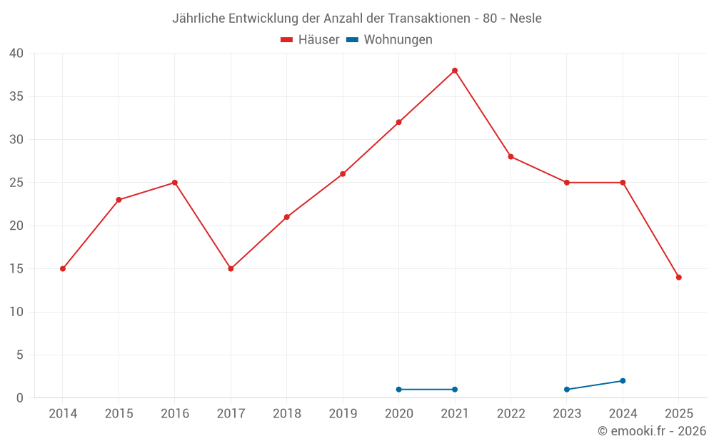 Der Durchschnittspreis auf den 28 Hausgeschäften der letzten 12 Monate in der Gemeinde Nesle betrug 1 084 € pro Quadratmeter für einen mittleren Immobilienwert von 93 000 €. Über diesen Zeitraum hinweg lagen 60% der Transaktionen zwischen 750 und 1 537 € pro Quadratmeter (vom 2. bis zum 8. Dezil).
