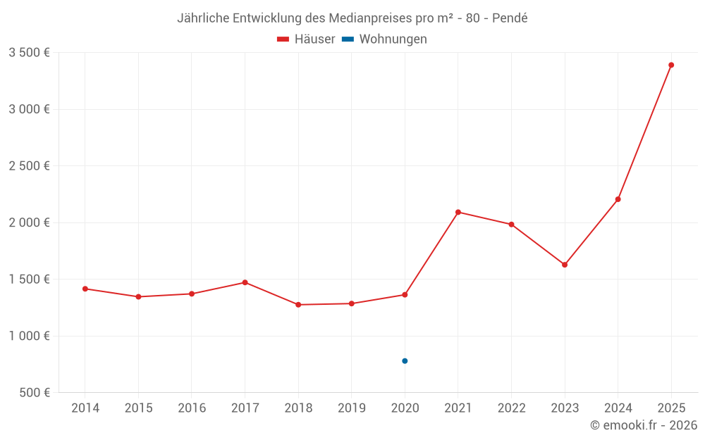 Der Durchschnittspreis auf den 23 Hausgeschäften der letzten 24 Monate in der Gemeinde Pendé betrug 2 444 € pro Quadratmeter für einen mittleren Immobilienwert von 183 200 €. Über diesen Zeitraum hinweg lagen 60% der Transaktionen zwischen 1 512 und 3 158 € pro Quadratmeter (vom 2. bis zum 8. Dezil).