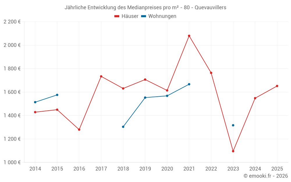 Der Durchschnittspreis auf den 14 Hausgeschäften der letzten 24 Monate in der Gemeinde Quevauvillers betrug 1 548 € pro Quadratmeter für einen mittleren Immobilienwert von 174 450 €. Über diesen Zeitraum hinweg lagen 60% der Transaktionen zwischen 1 052 und 2 048 € pro Quadratmeter (vom 2. bis zum 8. Dezil).