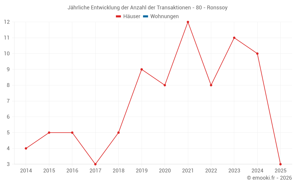 Der Durchschnittspreis auf den 17 Hausgeschäften der letzten 24 Monate in der Gemeinde Ronssoy betrug 752 € pro Quadratmeter für einen mittleren Immobilienwert von 100 000 €. Über diesen Zeitraum hinweg lagen 60% der Transaktionen zwischen 382 und 1 041 € pro Quadratmeter (vom 2. bis zum 8. Dezil).
