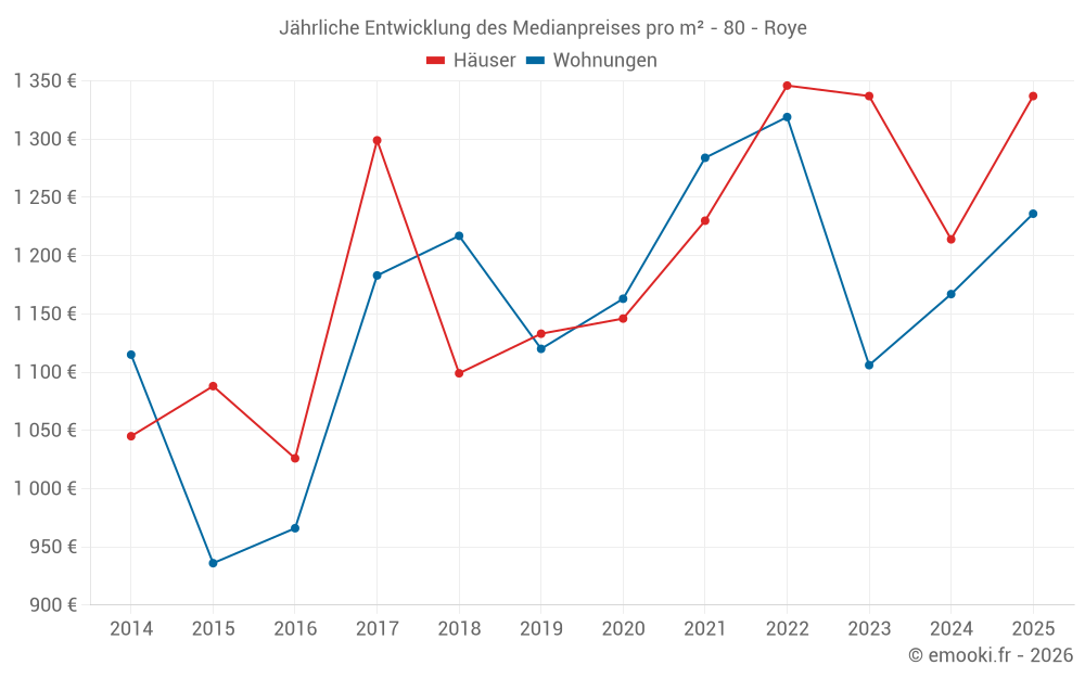 Der Durchschnittspreis auf den 25 Hausgeschäften der letzten 6 Monate in der Gemeinde Roye betrug 1 337 € pro Quadratmeter für einen mittleren Immobilienwert von 115 000 €. Über diesen Zeitraum hinweg lagen 60% der Transaktionen zwischen 951 und 1 585 € pro Quadratmeter (vom 2. bis zum 8. Dezil).