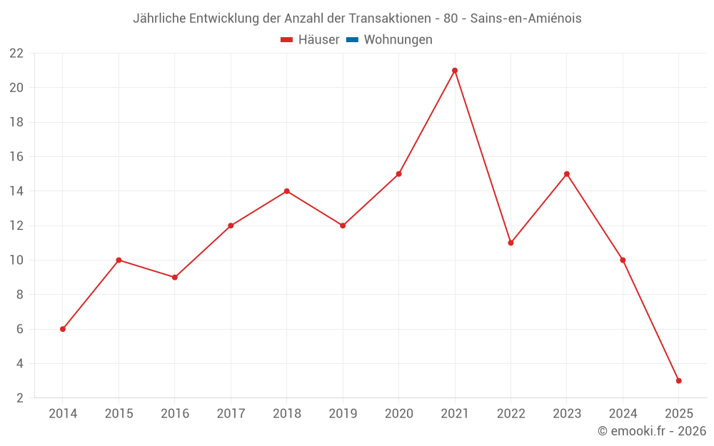 Der Durchschnittspreis auf den 21 Hausgeschäften der letzten 24 Monate in der Gemeinde Sains-en-Amiénois betrug 2 473 € pro Quadratmeter für einen mittleren Immobilienwert von 258 000 €. Über diesen Zeitraum hinweg lagen 60% der Transaktionen zwischen 2 206 und 2 870 € pro Quadratmeter (vom 2. bis zum 8. Dezil).