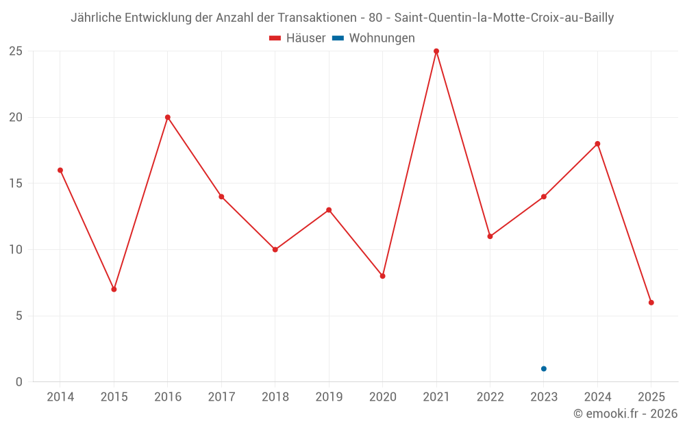 Der Durchschnittspreis auf den 18 Hausgeschäften der letzten 12 Monate in der Gemeinde Saint-Quentin-la-Motte-Croix-au-Bailly betrug 2 014 € pro Quadratmeter für einen mittleren Immobilienwert von 153 000 €. Über diesen Zeitraum hinweg lagen 60% der Transaktionen zwischen 1 369 und 2 454 € pro Quadratmeter (vom 2. bis zum 8. Dezil).