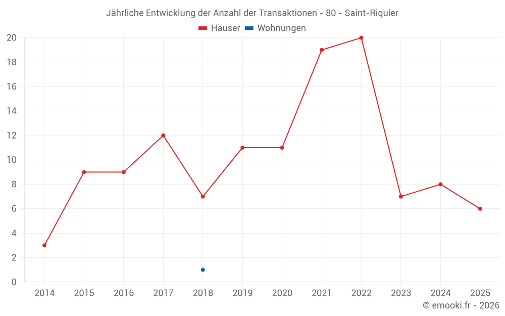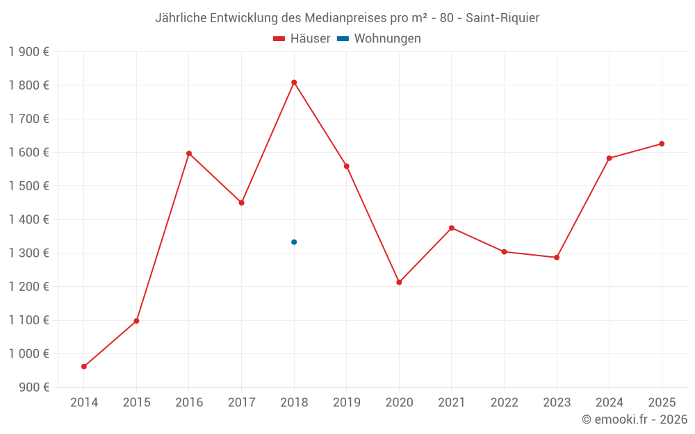 Der Durchschnittspreis auf den 18 Hausgeschäften der letzten 24 Monate in der Gemeinde Saint-Riquier betrug 1 606 € pro Quadratmeter für einen mittleren Immobilienwert von 140 875 €. Über diesen Zeitraum hinweg lagen 60% der Transaktionen zwischen 904 und 2 071 € pro Quadratmeter (vom 2. bis zum 8. Dezil).