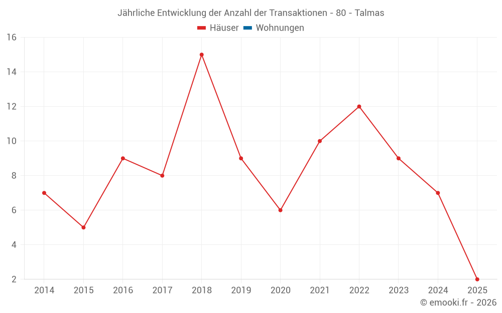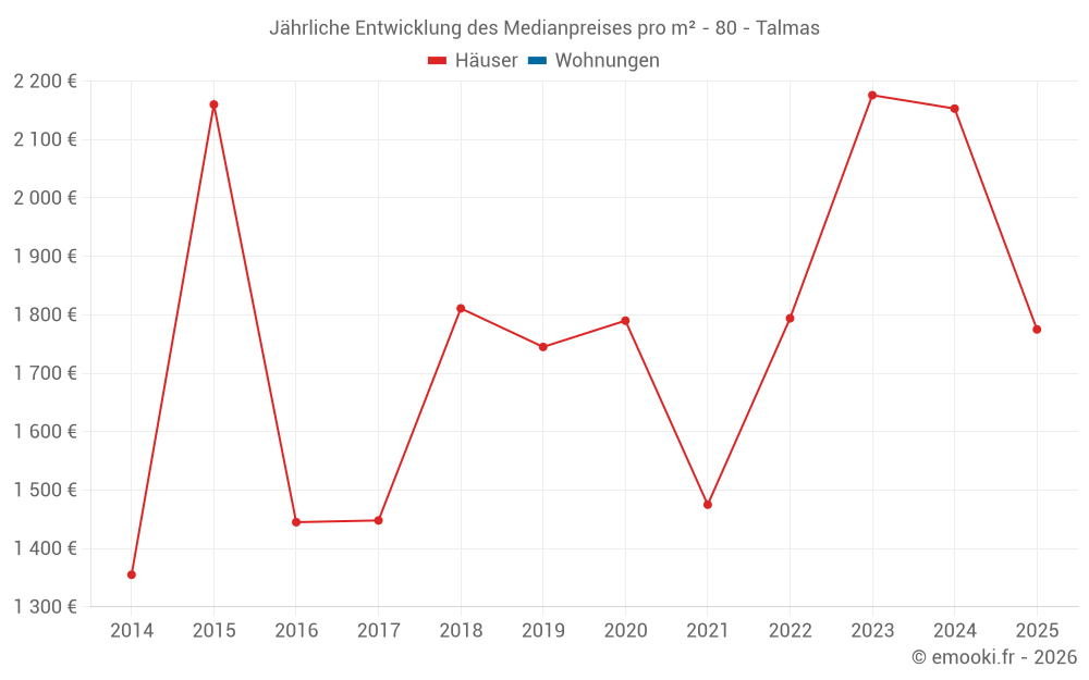 Der Durchschnittspreis auf den 14 Hausgeschäften der letzten 24 Monate in der Gemeinde Talmas betrug 2 125 € pro Quadratmeter für einen mittleren Immobilienwert von 250 018 €. Über diesen Zeitraum hinweg lagen 60% der Transaktionen zwischen 1 764 und 2 210 € pro Quadratmeter (vom 2. bis zum 8. Dezil).