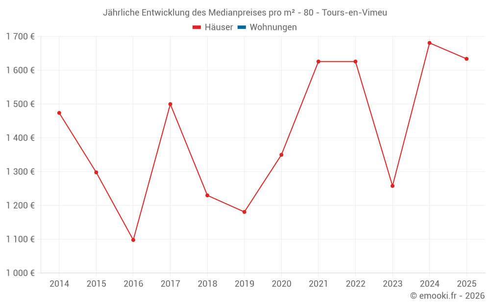 Der Durchschnittspreis auf den 17 Hausgeschäften der letzten 24 Monate in der Gemeinde Tours-en-Vimeu betrug 1 442 € pro Quadratmeter für einen mittleren Immobilienwert von 128 500 €. Über diesen Zeitraum hinweg lagen 60% der Transaktionen zwischen 936 und 2 156 € pro Quadratmeter (vom 2. bis zum 8. Dezil).