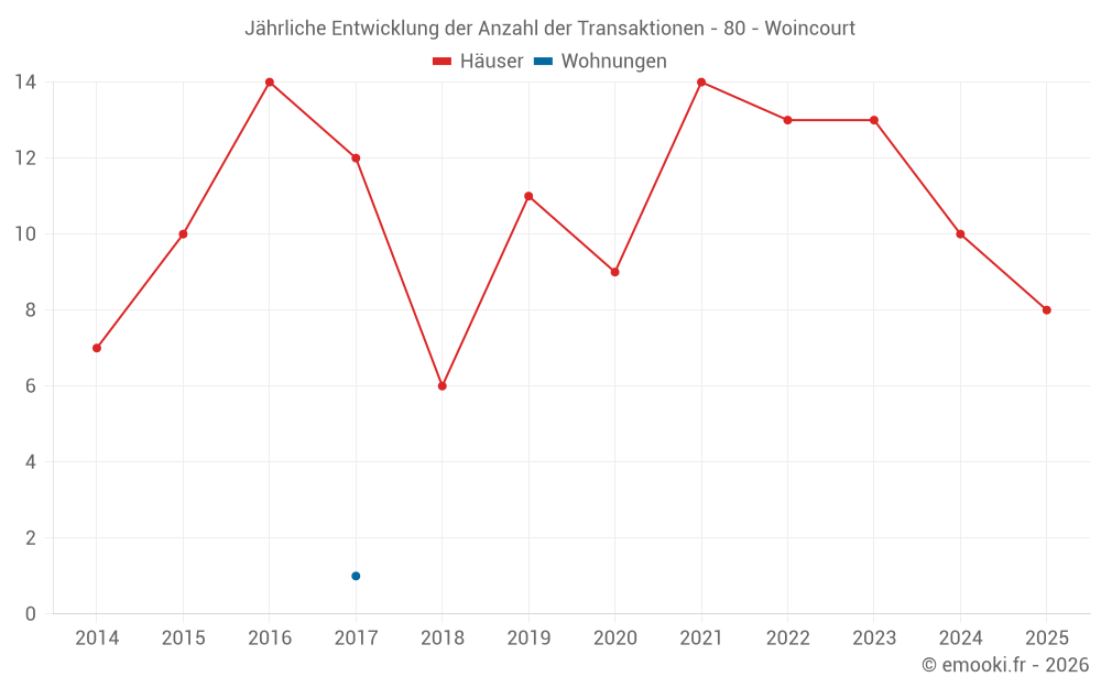 Der Durchschnittspreis auf den 24 Hausgeschäften der letzten 24 Monate in der Gemeinde Woincourt betrug 1 258 € pro Quadratmeter für einen mittleren Immobilienwert von 105 500 €. Über diesen Zeitraum hinweg lagen 60% der Transaktionen zwischen 719 und 1 671 € pro Quadratmeter (vom 2. bis zum 8. Dezil).