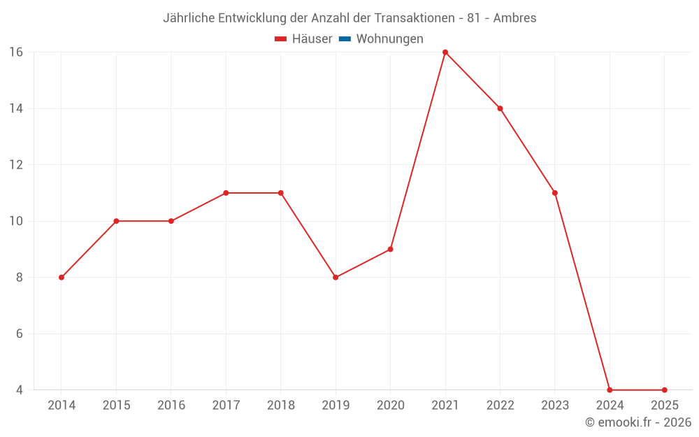 Der Durchschnittspreis auf den 16 Hausgeschäften der letzten 24 Monate in der Gemeinde Ambres betrug 2 255 € pro Quadratmeter für einen mittleren Immobilienwert von 247 945 €. Über diesen Zeitraum hinweg lagen 60% der Transaktionen zwischen 1 643 und 2 637 € pro Quadratmeter (vom 2. bis zum 8. Dezil).