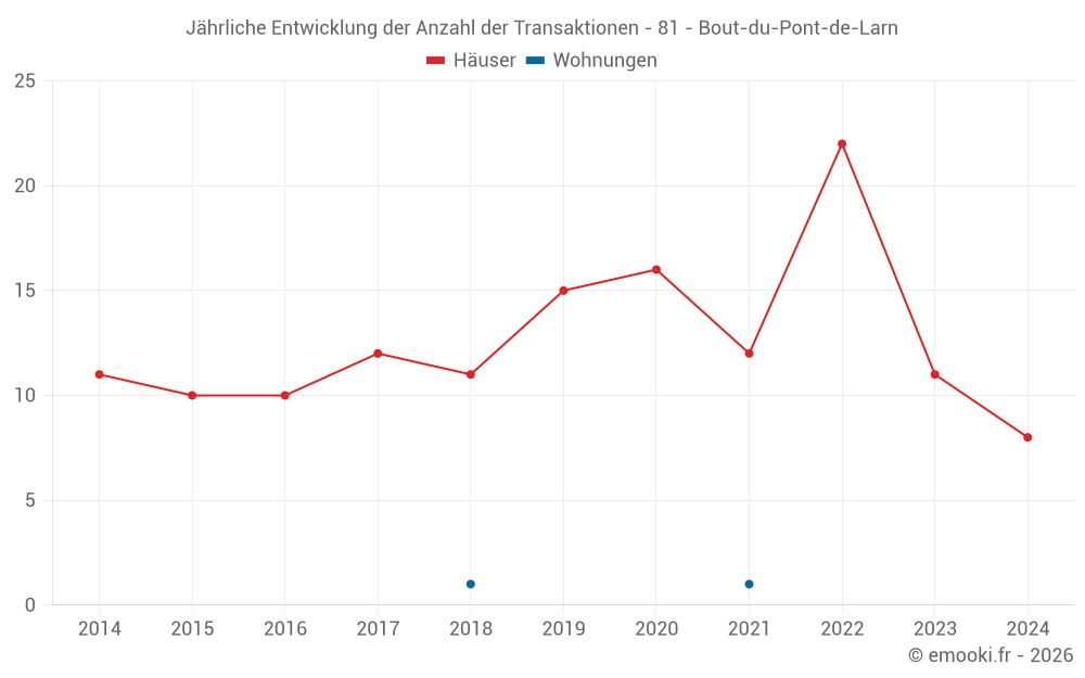 Der Durchschnittspreis auf den 15 Hausgeschäften der letzten 24 Monate in der Gemeinde Bout-du-Pont-de-Larn betrug 1 467 € pro Quadratmeter für einen mittleren Immobilienwert von 150 000 €. Über diesen Zeitraum hinweg lagen 60% der Transaktionen zwischen 891 und 1 925 € pro Quadratmeter (vom 2. bis zum 8. Dezil).
