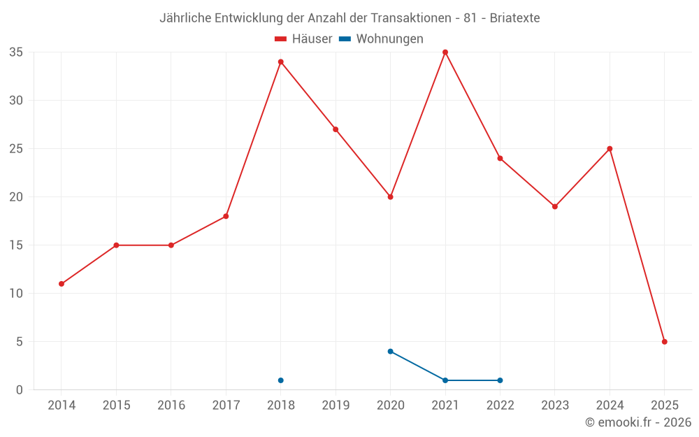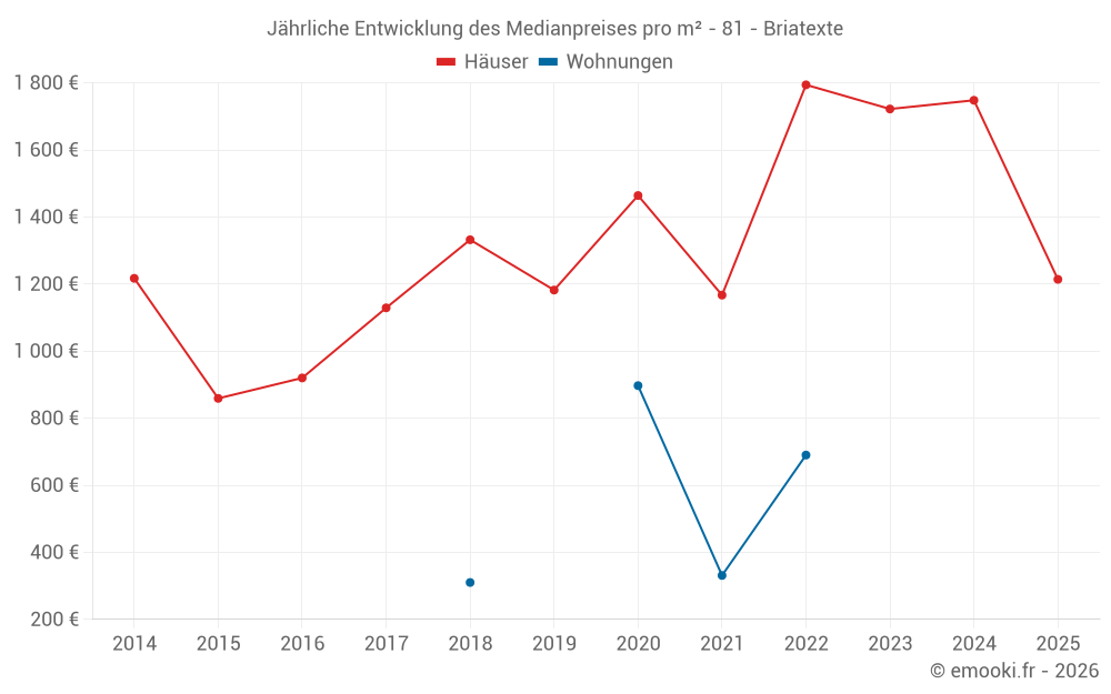 Der Durchschnittspreis auf den 22 Hausgeschäften der letzten 12 Monate in der Gemeinde Briatexte betrug 1 794 € pro Quadratmeter für einen mittleren Immobilienwert von 178 500 €. Über diesen Zeitraum hinweg lagen 60% der Transaktionen zwischen 1 145 und 2 263 € pro Quadratmeter (vom 2. bis zum 8. Dezil).