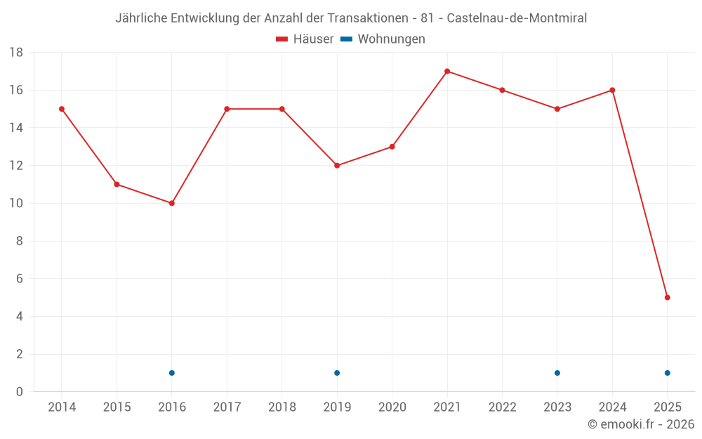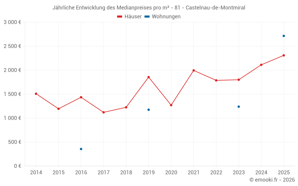 Der Durchschnittspreis auf den 18 Hausgeschäften der letzten 12 Monate in der Gemeinde Castelnau-de-Montmiral betrug 2 164 € pro Quadratmeter für einen mittleren Immobilienwert von 213 100 €. Über diesen Zeitraum hinweg lagen 60% der Transaktionen zwischen 1 199 und 2 936 € pro Quadratmeter (vom 2. bis zum 8. Dezil).