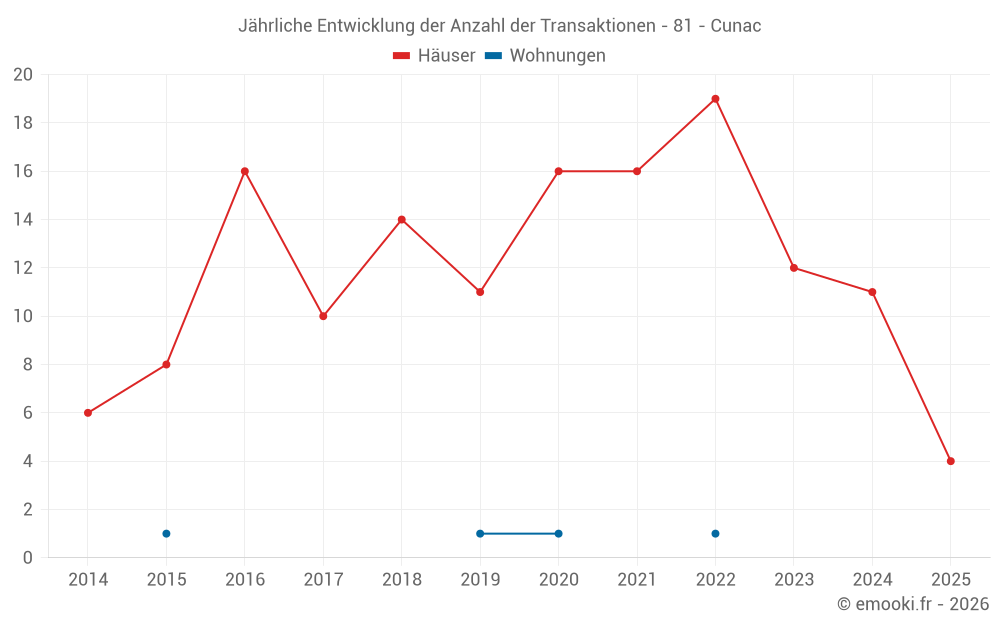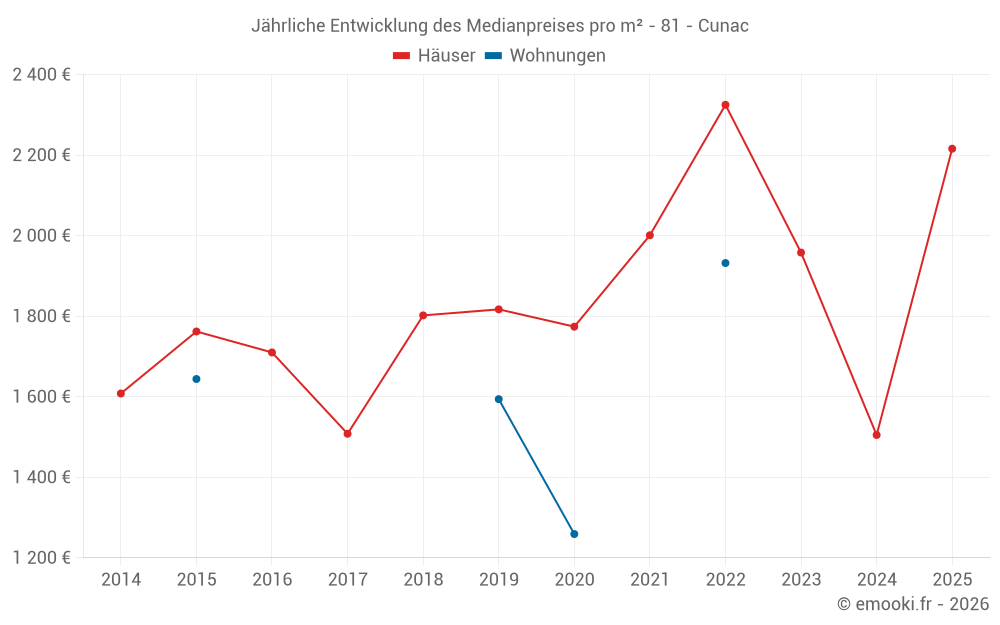 Der Durchschnittspreis auf den 23 Hausgeschäften der letzten 24 Monate in der Gemeinde Cunac betrug 1 875 € pro Quadratmeter für einen mittleren Immobilienwert von 186 900 €. Über diesen Zeitraum hinweg lagen 60% der Transaktionen zwischen 1 166 und 2 228 € pro Quadratmeter (vom 2. bis zum 8. Dezil).