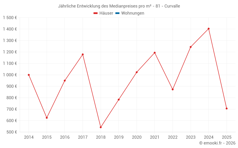 Der Durchschnittspreis auf den 16 Hausgeschäften der letzten 24 Monate in der Gemeinde Curvalle betrug 1 088 € pro Quadratmeter für einen mittleren Immobilienwert von 92 500 €. Über diesen Zeitraum hinweg lagen 60% der Transaktionen zwischen 444 und 1 563 € pro Quadratmeter (vom 2. bis zum 8. Dezil).