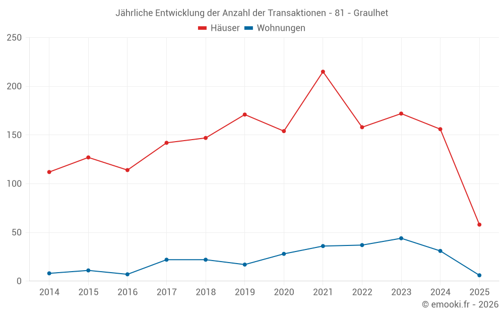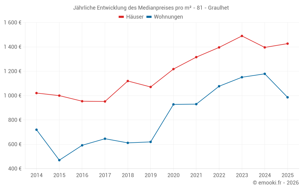 Der Durchschnittspreis auf den 58 Hausgeschäften der letzten 6 Monate in der Gemeinde Graulhet betrug 1 427 € pro Quadratmeter für einen mittleren Immobilienwert von 128 500 €. Über diesen Zeitraum hinweg lagen 60% der Transaktionen zwischen 891 und 1 990 € pro Quadratmeter (vom 2. bis zum 8. Dezil).