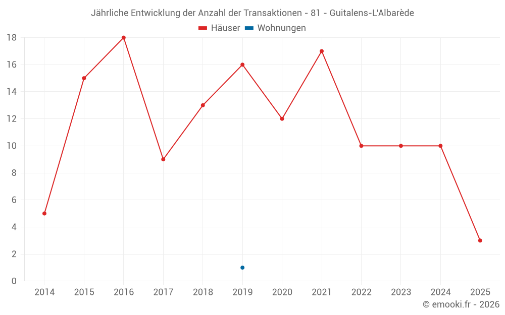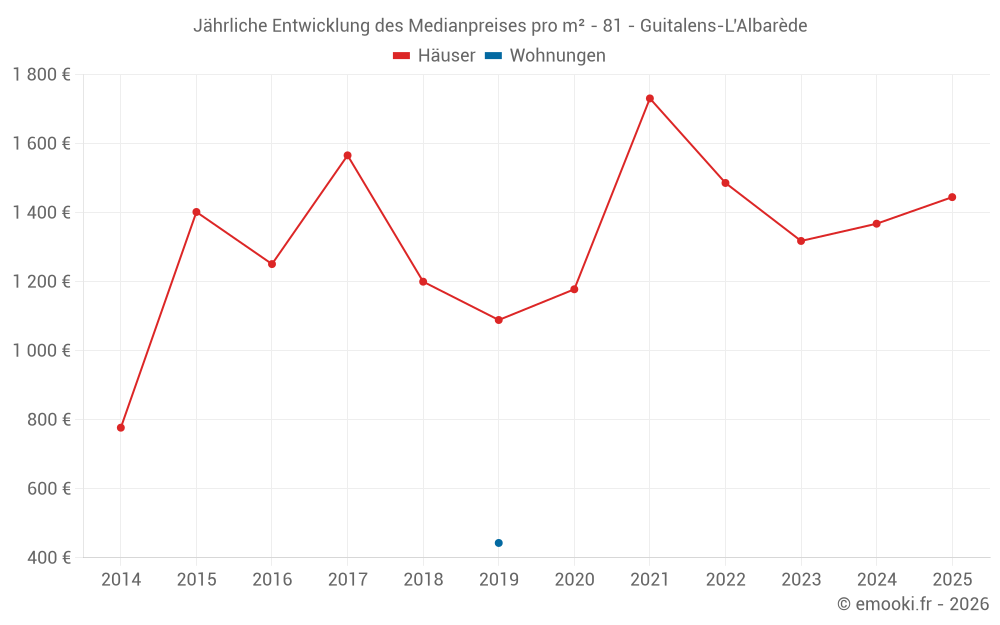 Der Durchschnittspreis auf den 16 Hausgeschäften der letzten 24 Monate in der Gemeinde Guitalens-L'Albarède betrug 1 338 € pro Quadratmeter für einen mittleren Immobilienwert von 135 237 €. Über diesen Zeitraum hinweg lagen 60% der Transaktionen zwischen 1 089 und 1 591 € pro Quadratmeter (vom 2. bis zum 8. Dezil).
