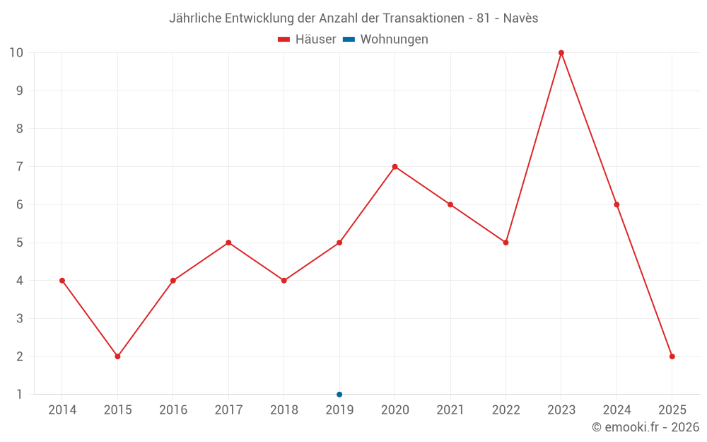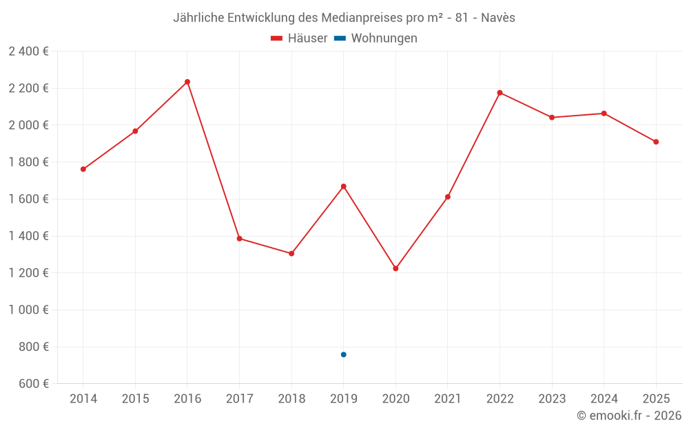 Der Durchschnittspreis auf den 15 Hausgeschäften der letzten 24 Monate in der Gemeinde Navès betrug 2 088 € pro Quadratmeter für einen mittleren Immobilienwert von 200 000 €. Über diesen Zeitraum hinweg lagen 60% der Transaktionen zwischen 1 379 und 2 268 € pro Quadratmeter (vom 2. bis zum 8. Dezil).
